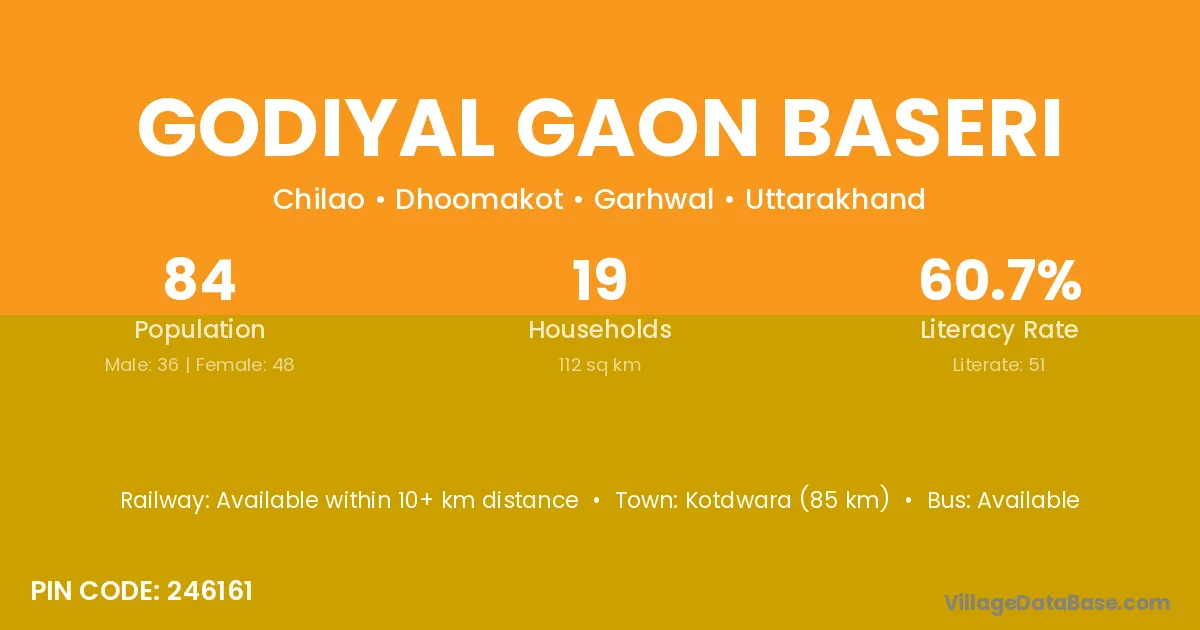 Godiyal Gaon Baseri village has a total population of 84 people, of which 36 are males and 48 are females.
