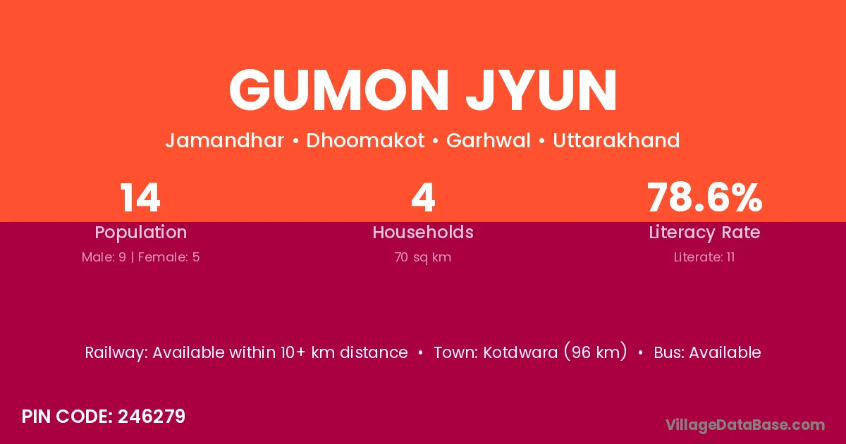 Kotdwara (96 km) is the nearest town to Gumon Jyun village for major economic activities and is located approximately 96 km away.