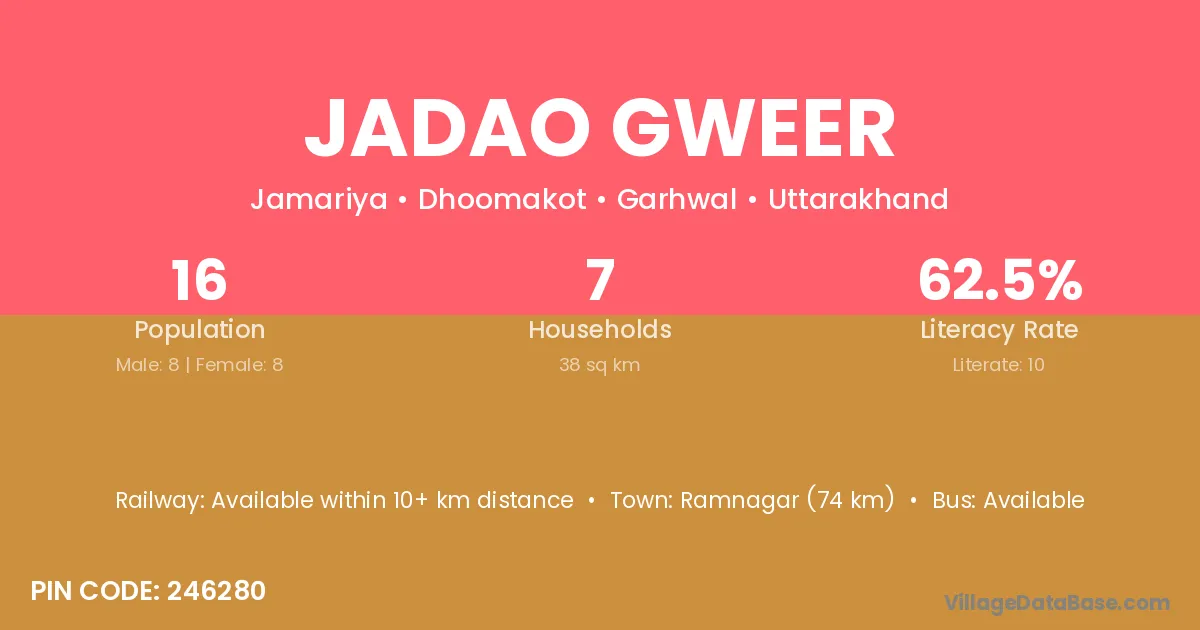 Ramnagar (74 km) is the nearest town to Jadao Gweer village for major economic activities and is located approximately 74 km away.