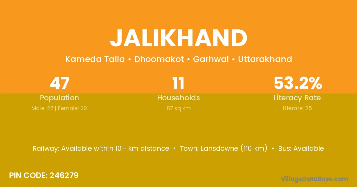 Lansdowne (110 km) is the nearest town to Jalikhand village for major economic activities and is located approximately 110 km away.