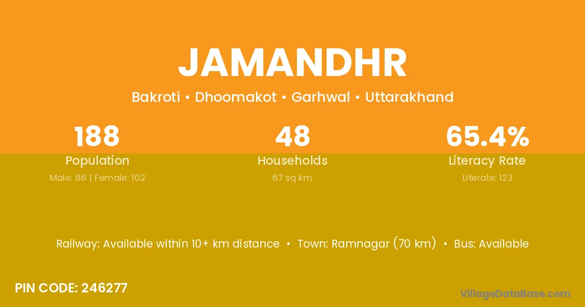 Ramnagar (70 km) is the nearest town to Jamandhr village for major economic activities and is located approximately 70 km away.