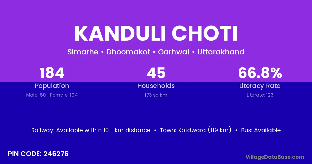 Kotdwara (119 km) is the nearest town to Kanduli Choti village for major economic activities and is located approximately 119 km away.