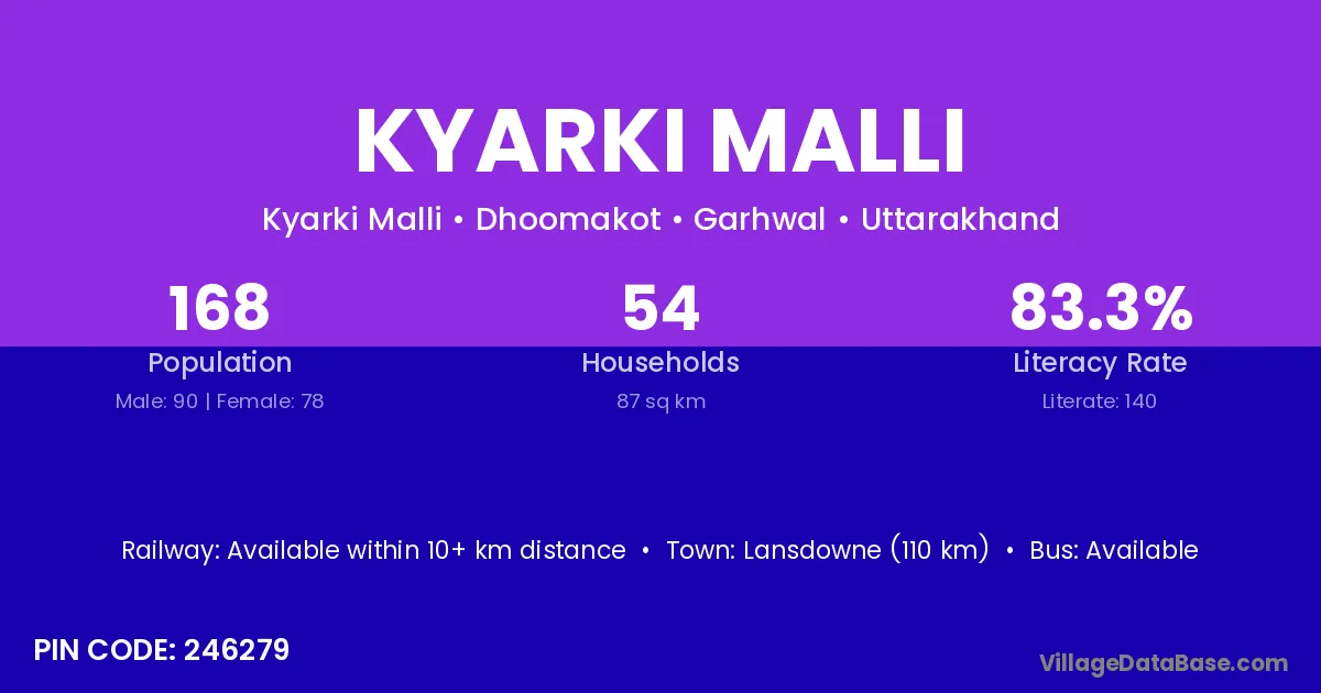 Lansdowne (110 km) is the nearest town to Kyarki Malli village for major economic activities and is located approximately 110 km away.