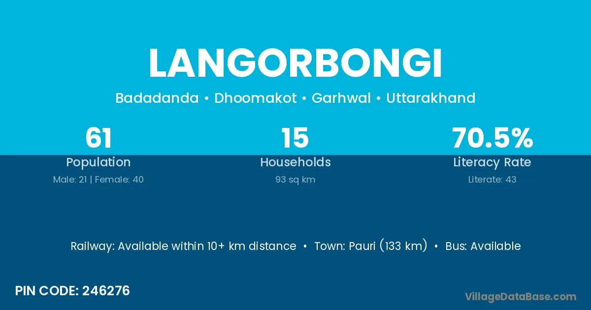 Pauri (133 km) is the nearest town to Langorbongi village for major economic activities and is located approximately 133 km away.