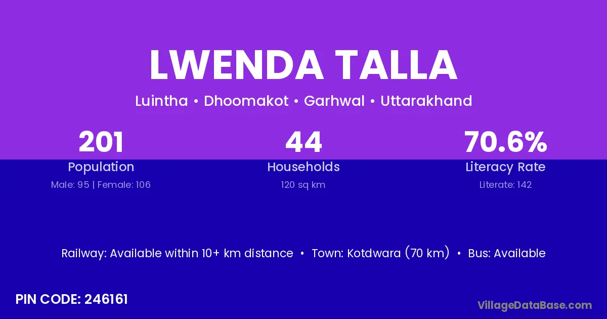 Kotdwara (70 km) is the nearest town to Lwenda Talla village for major economic activities and is located approximately 70 km away.