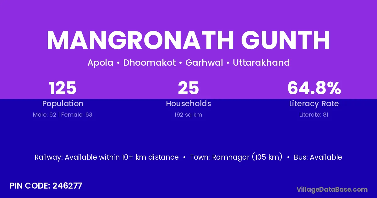 Ramnagar (105 km) is the nearest town to Mangronath Gunth village for major economic activities and is located approximately 105 km away.
