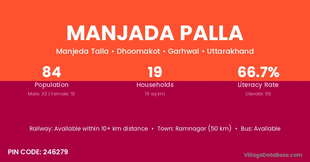 Ramnagar (50 km) is the nearest town to Manjada Palla village for major economic activities and is located approximately 50 km away.