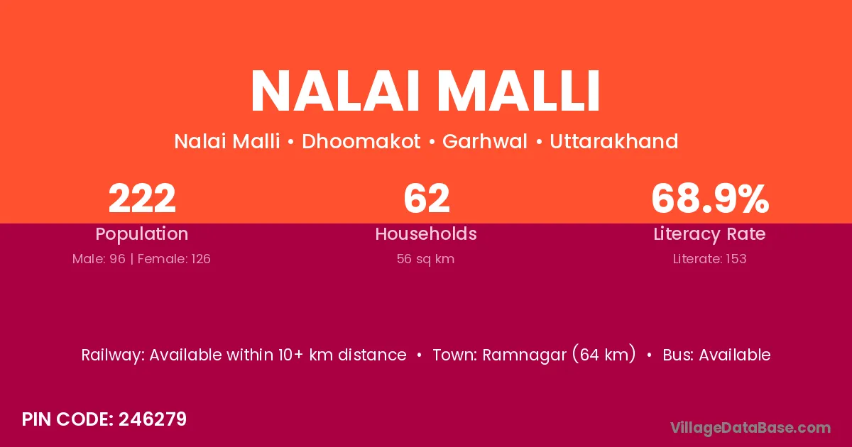 Ramnagar (64 km) is the nearest town to Nalai Malli village for major economic activities and is located approximately 64 km away.