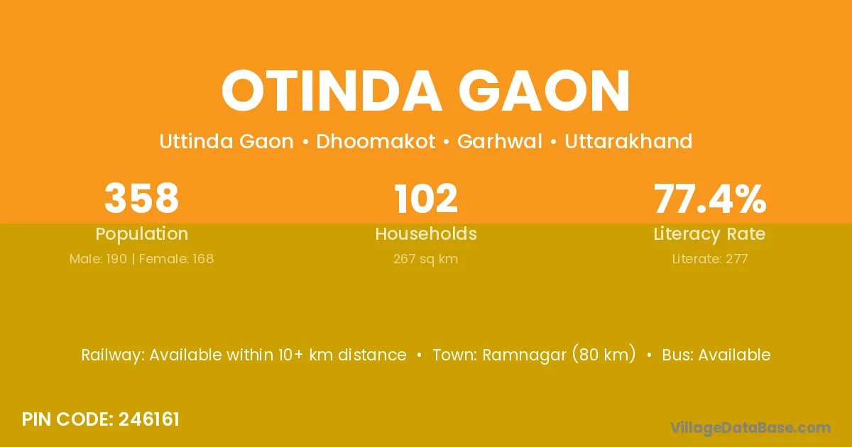 Ramnagar (80 km) is the nearest town to Otinda Gaon village for major economic activities and is located approximately 80 km away.