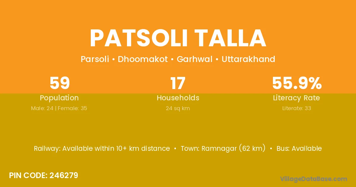 Ramnagar (62 km) is the nearest town to Patsoli Talla village for major economic activities and is located approximately 62 km away.
