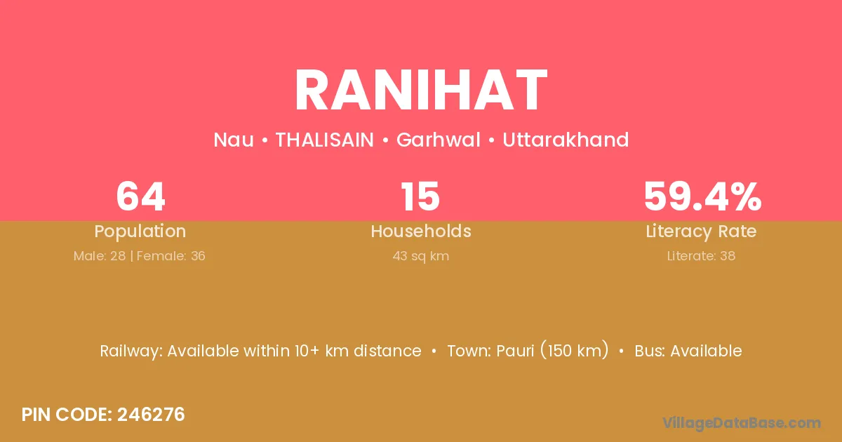 Kotdwara (83 km) is the nearest town to Ranihat village for major economic activities and is located approximately 83 km away.