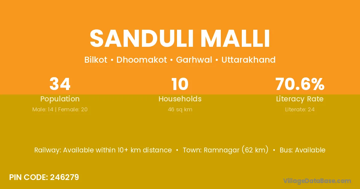 Ramnagar (62 km) is the nearest town to Sanduli Malli village for major economic activities and is located approximately 62 km away.