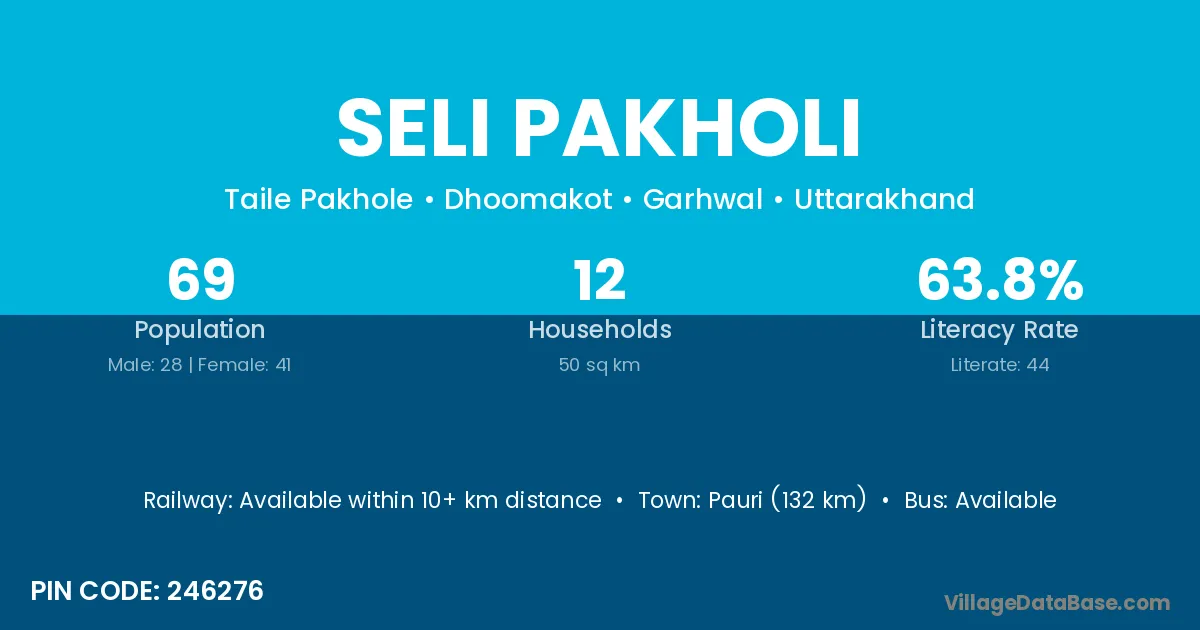 Pauri (132 km) is the nearest town to Seli Pakholi village for major economic activities and is located approximately 132 km away.