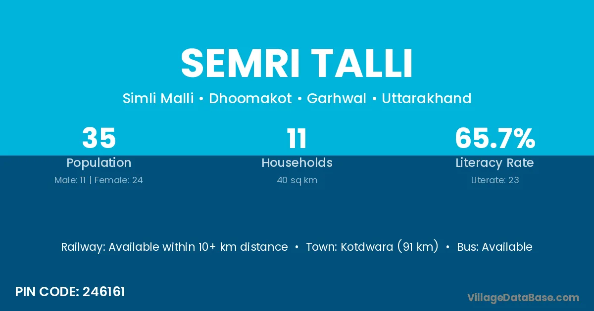 Kotdwara (91 km) is the nearest town to Semri Talli village for major economic activities and is located approximately 91 km away.