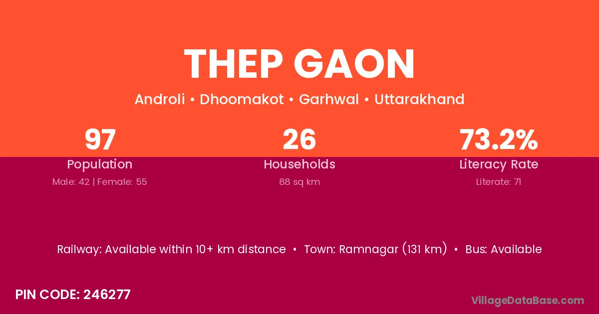 Ramnagar (131 km) is the nearest town to Thep Gaon village for major economic activities and is located approximately 131 km away.