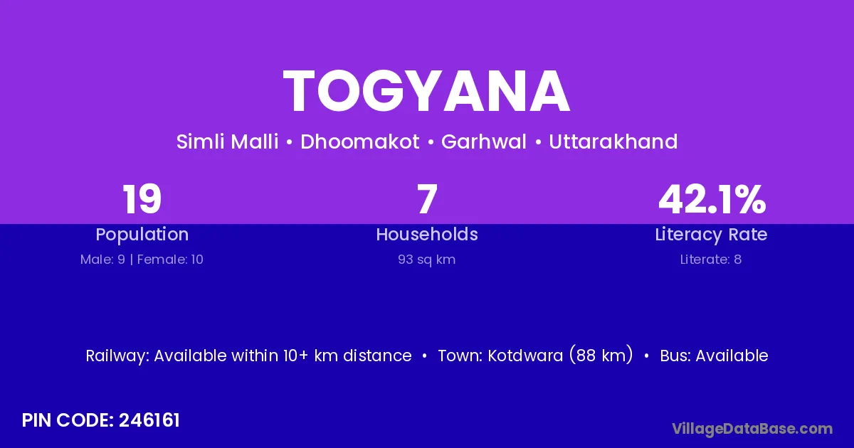 Kotdwara (88 km) is the nearest town to Togyana village for major economic activities and is located approximately 88 km away.
