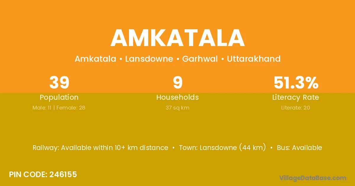 Lansdowne (44 km) is the nearest town to Amkatala village for major economic activities and is located approximately 44 km away.