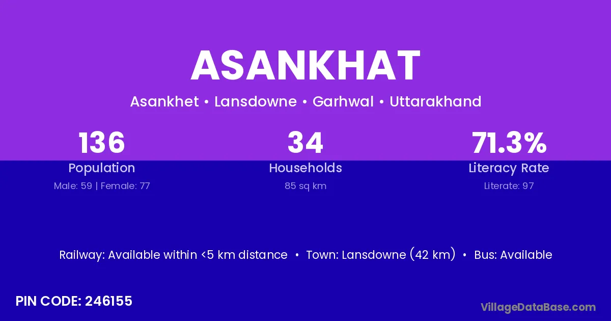Lansdowne (42 km) is the nearest town to Asankhat village for major economic activities and is located approximately 42 km away.