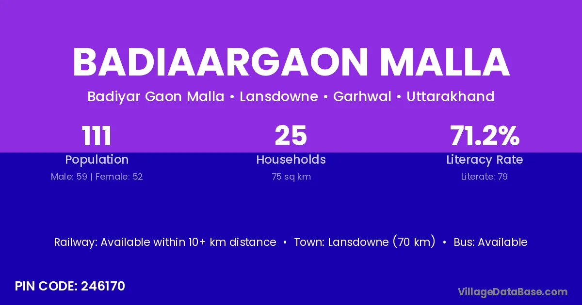 Lansdowne (70 km) is the nearest town to Badiaargaon Malla village for major economic activities and is located approximately 70 km away.