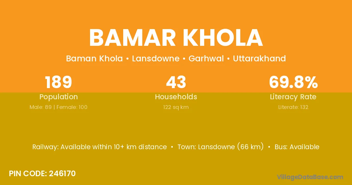 Lansdowne (66 km) is the nearest town to Bamar Khola village for major economic activities and is located approximately 66 km away.