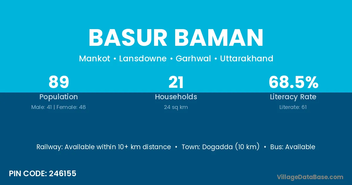 Dogadda (10 km) is the nearest town to Basur Baman village for major economic activities and is located approximately 10 km away.