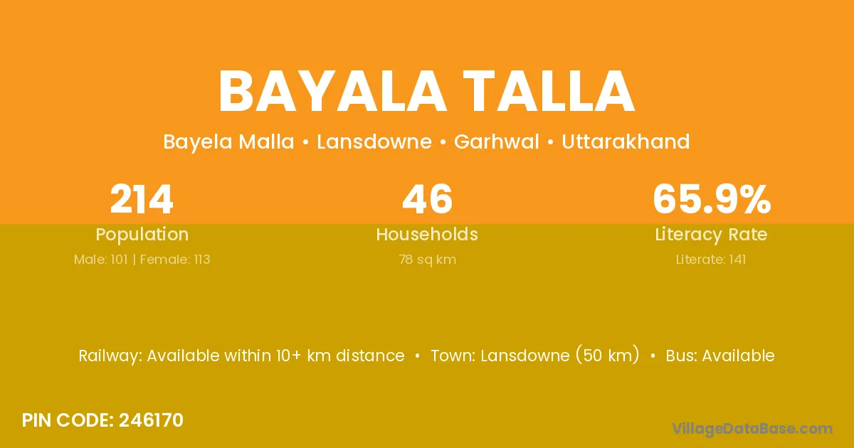 Lansdowne (50 km) is the nearest town to Bayala Talla village for major economic activities and is located approximately 50 km away.