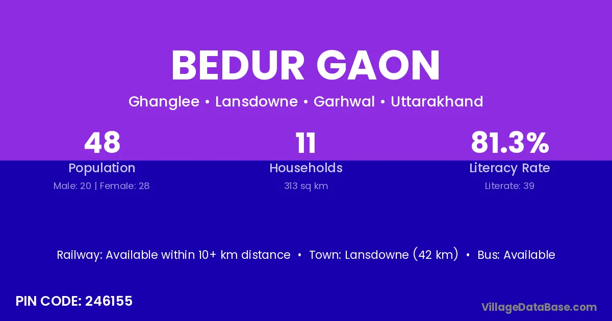 Lansdowne (42 km) is the nearest town to Bedur Gaon village for major economic activities and is located approximately 42 km away.