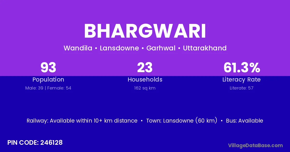 Lansdowne (60 km) is the nearest town to Bhargwari village for major economic activities and is located approximately 60 km away.