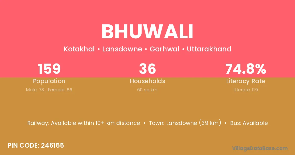 Lansdowne (39 km) is the nearest town to Bhuwali village for major economic activities and is located approximately 39 km away.