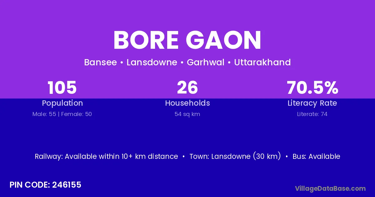 Lansdowne (30 km) is the nearest town to Bore Gaon village for major economic activities and is located approximately 30 km away.