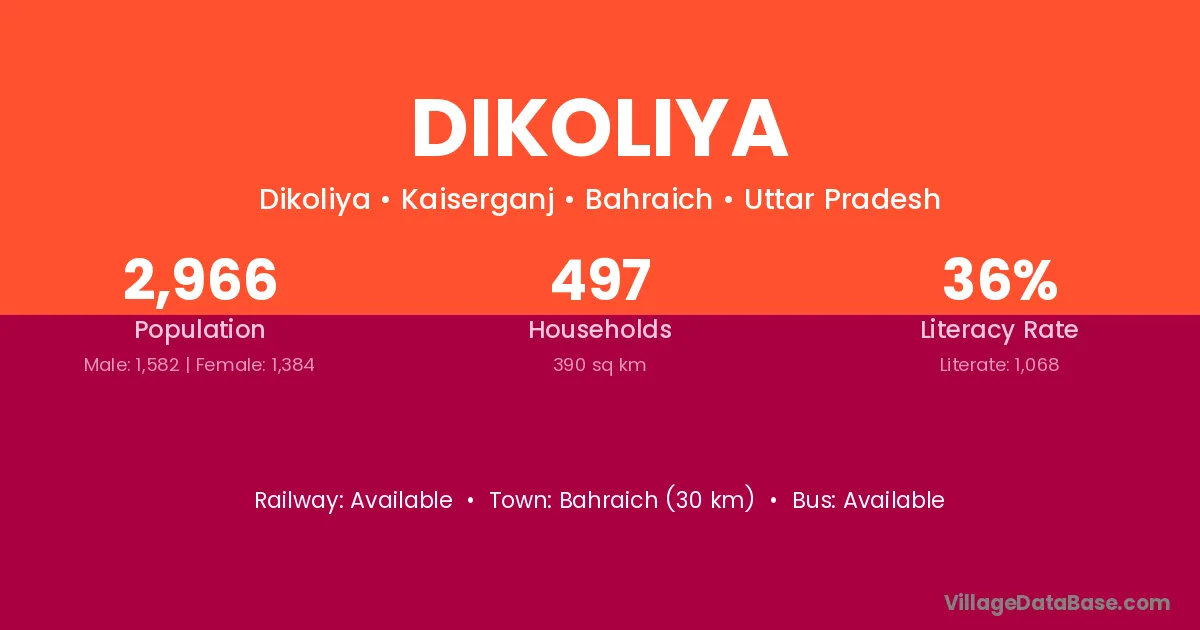 The literacy rate of Dikoliya village is 64.73%. Male literacy stands at 80.31% and female literacy at 51.35%.