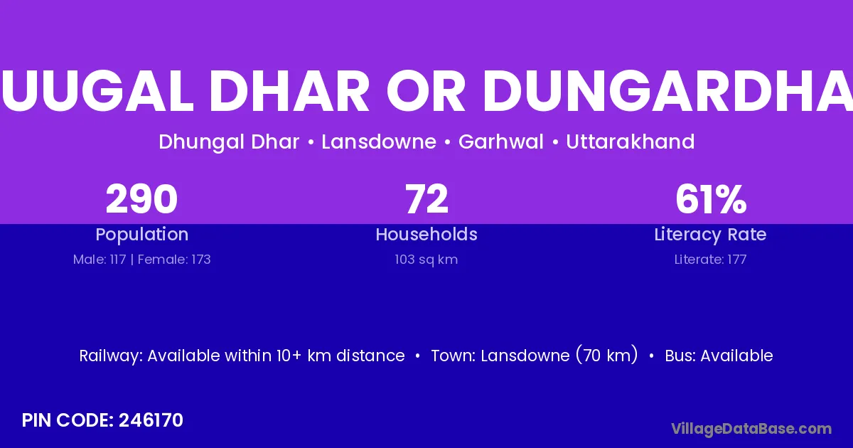 Duugal Dhar Or Dungardhar village has a total population of 290 people, of which 117 are males and 173 are females.