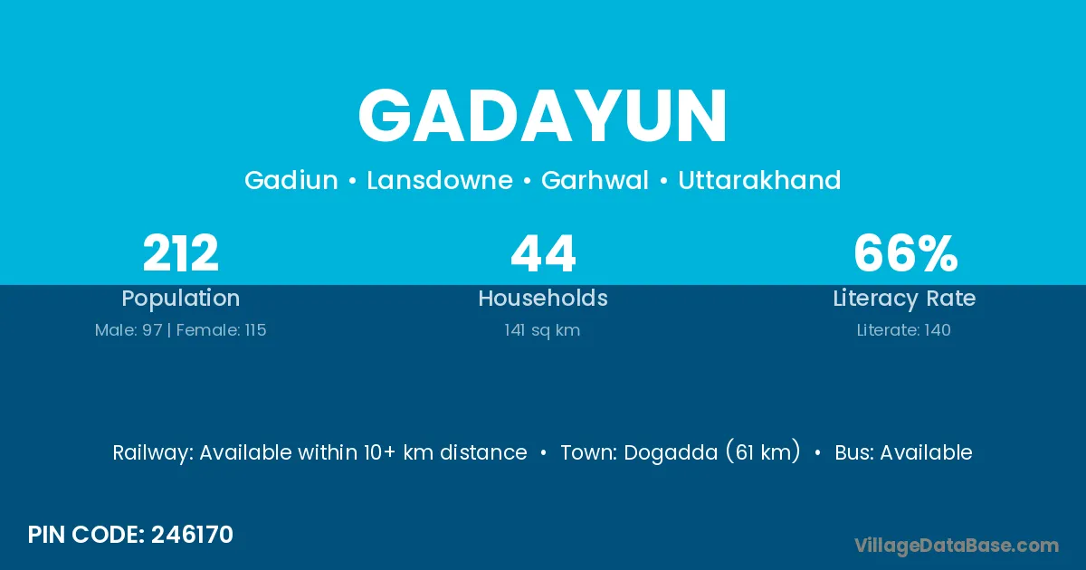 Dogadda (61 km) is the nearest town to Gadayun village for major economic activities and is located approximately 61 km away.