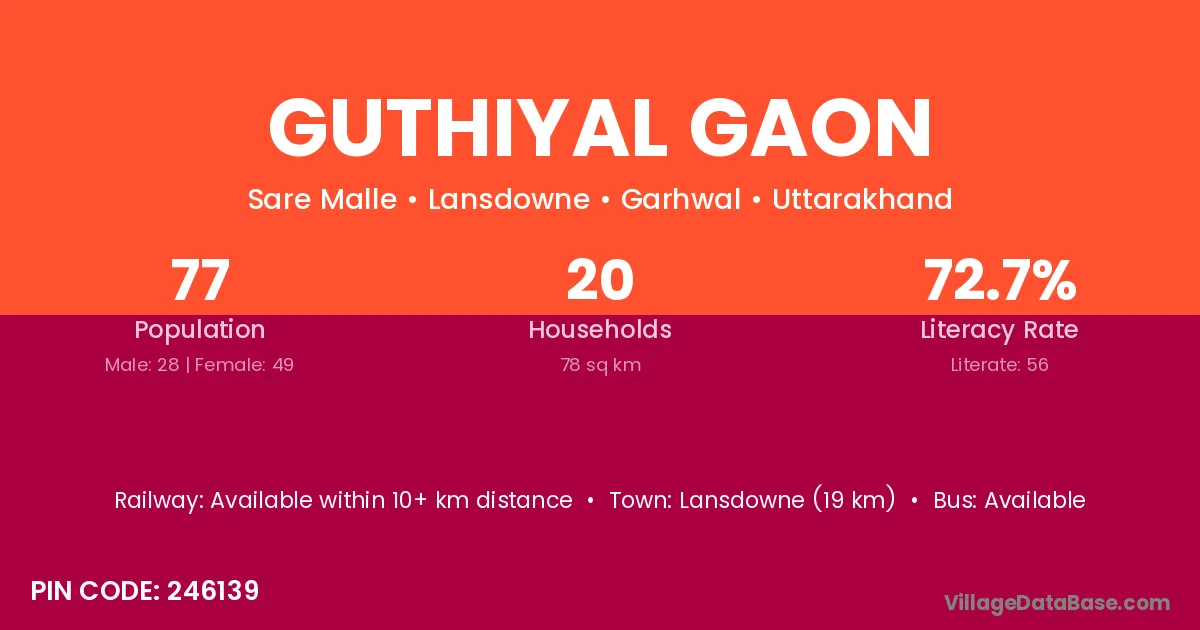 Lansdowne (19 km) is the nearest town to Guthiyal Gaon village for major economic activities and is located approximately 19 km away.