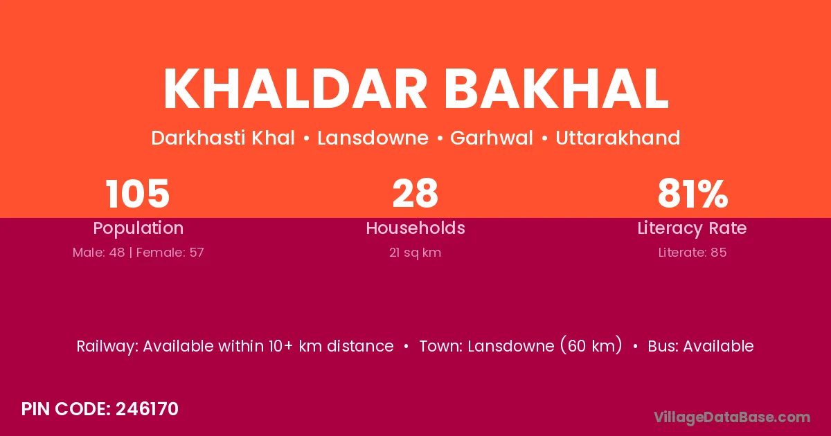 Lansdowne (60 km) is the nearest town to Khaldar Bakhal village for major economic activities and is located approximately 60 km away.