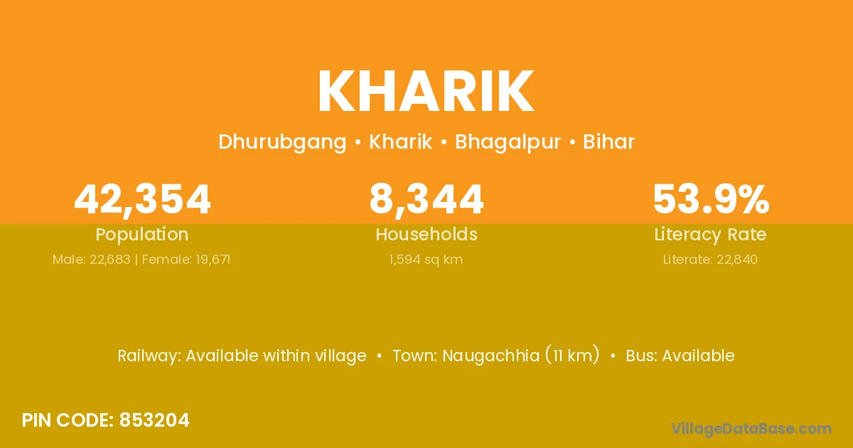 The literacy rate of Kharik village is 71.08%. Male literacy stands at 85.71% and female literacy at 57.89%.
