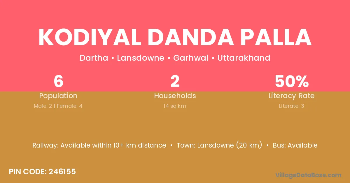 Lansdowne (20 km) is the nearest town to Kodiyal Danda Palla village for major economic activities and is located approximately 20 km away.