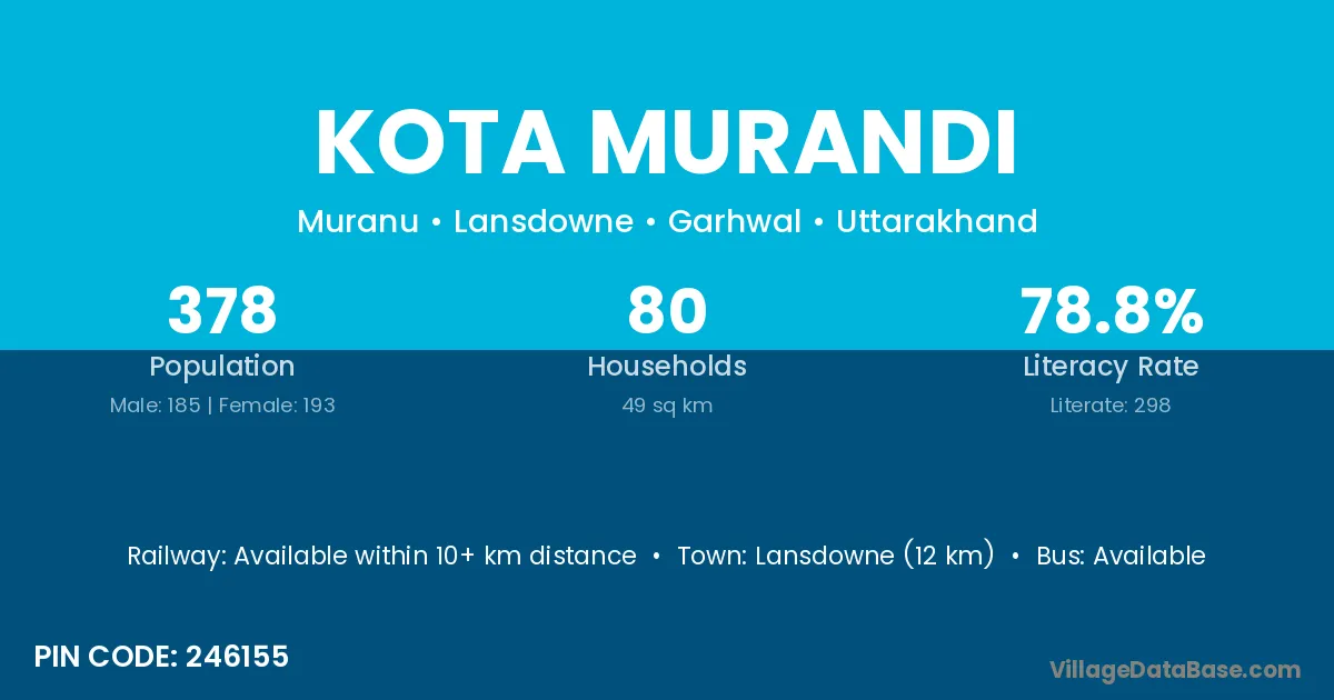 Lansdowne (12 km) is the nearest town to Kota Murandi village for major economic activities and is located approximately 12 km away.