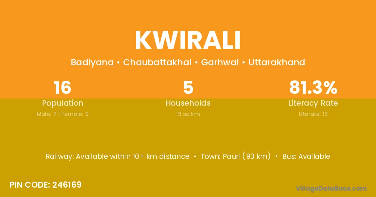 Lansdowne (78 km) is the nearest town to Kwirali village for major economic activities and is located approximately 78 km away.