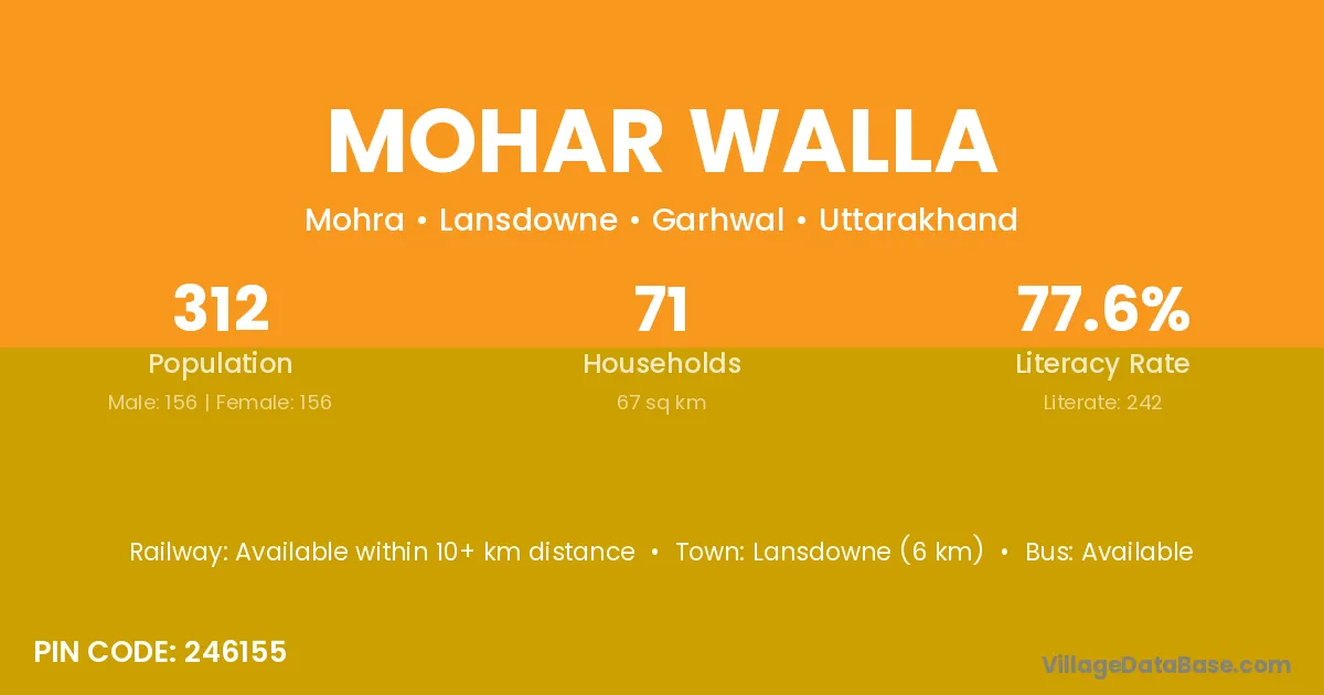 Lansdowne (6 km) is the nearest town to Mohar Walla village for major economic activities and is located approximately 6 km away.