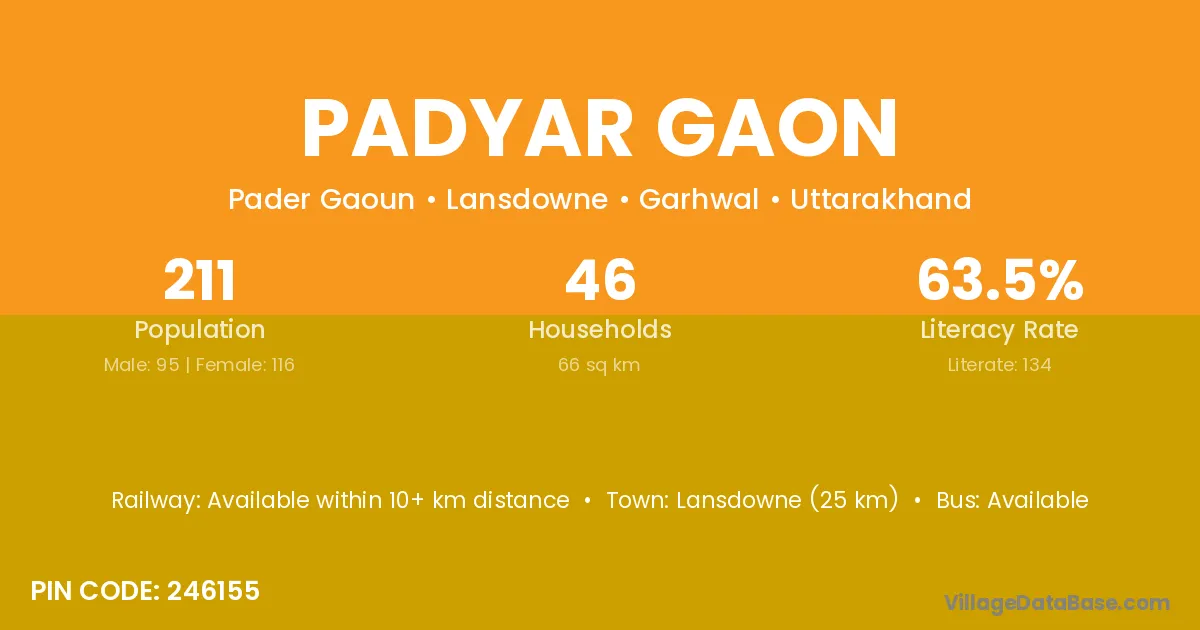 Lansdowne (25 km) is the nearest town to Padyar Gaon village for major economic activities and is located approximately 25 km away.