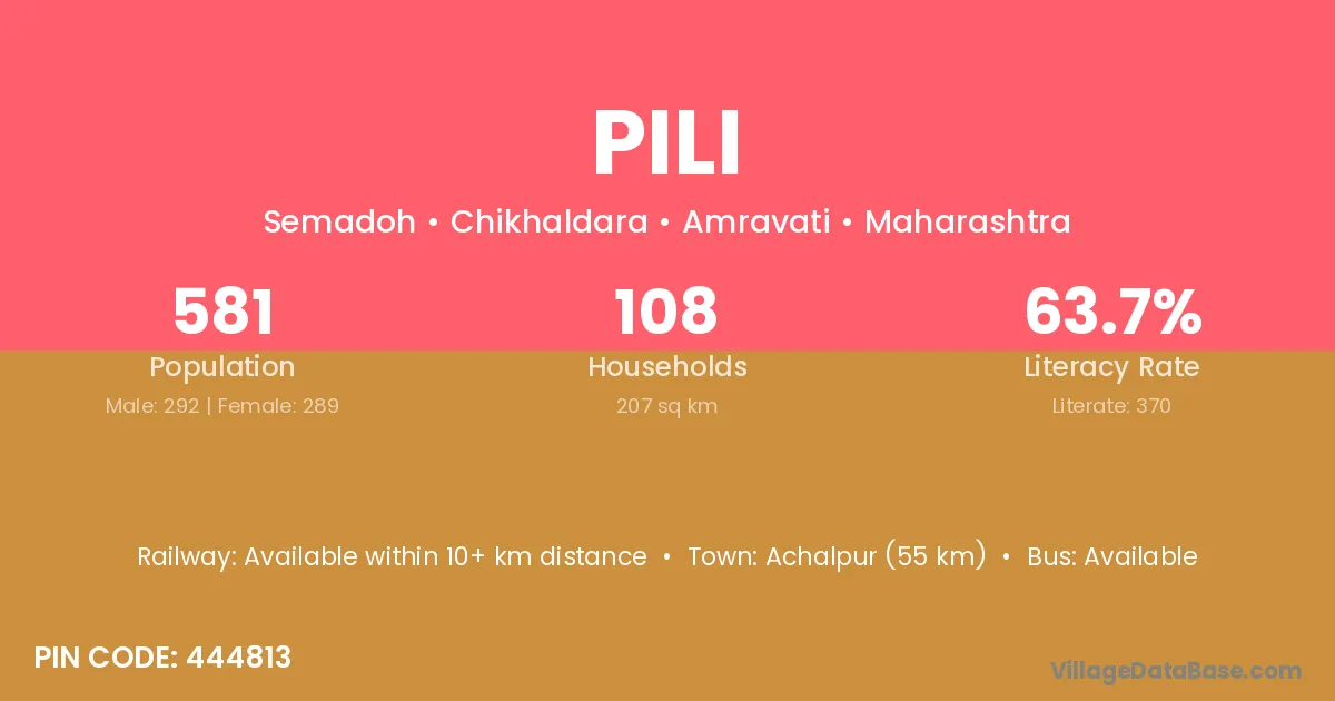 The literacy rate of Pili village is 68.28%. Male literacy stands at 84.15% and female literacy at 55.77%.