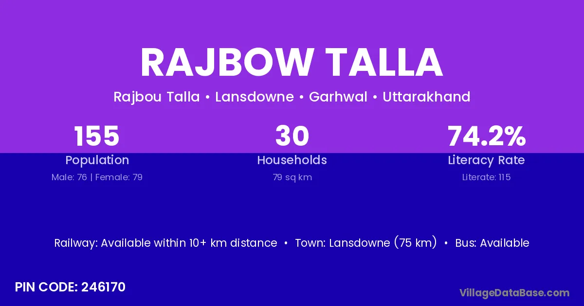 Lansdowne (75 km) is the nearest town to Rajbow Talla village for major economic activities and is located approximately 75 km away.