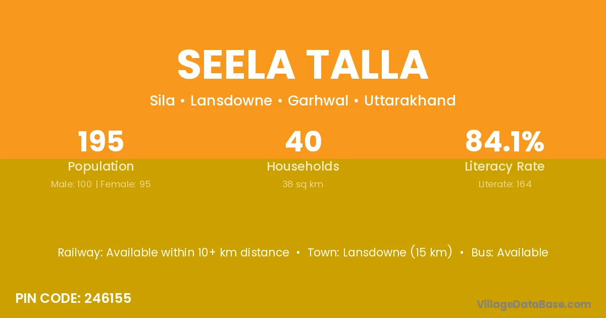 Lansdowne (15 km) is the nearest town to Seela Talla village for major economic activities and is located approximately 15 km away.