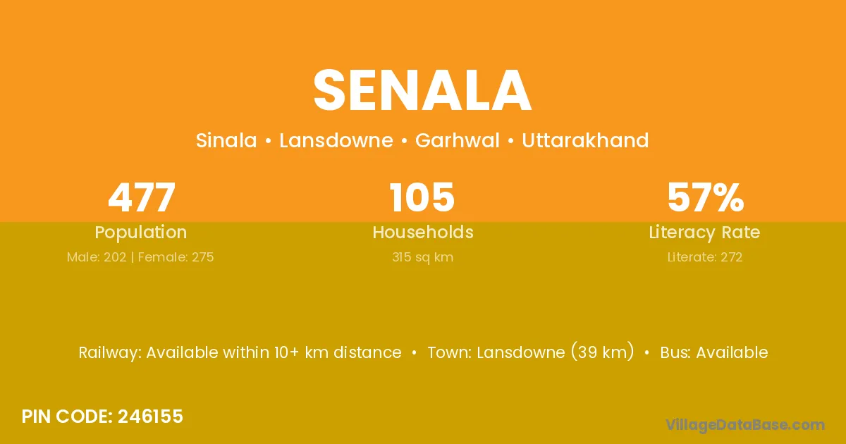 Lansdowne (39 km) is the nearest town to Senala village for major economic activities and is located approximately 39 km away.