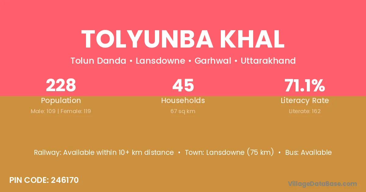 Lansdowne (75 km) is the nearest town to Tolyunba Khal village for major economic activities and is located approximately 75 km away.