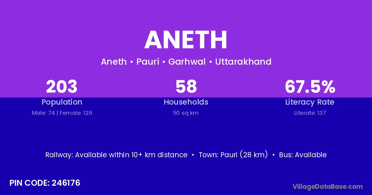 Pauri (28 km) is the nearest town to Aneth village for major economic activities and is located approximately 28 km away.