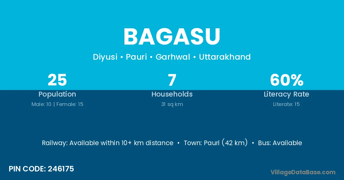 Pauri (42 km) is the nearest town to Bagasu village for major economic activities and is located approximately 42 km away.