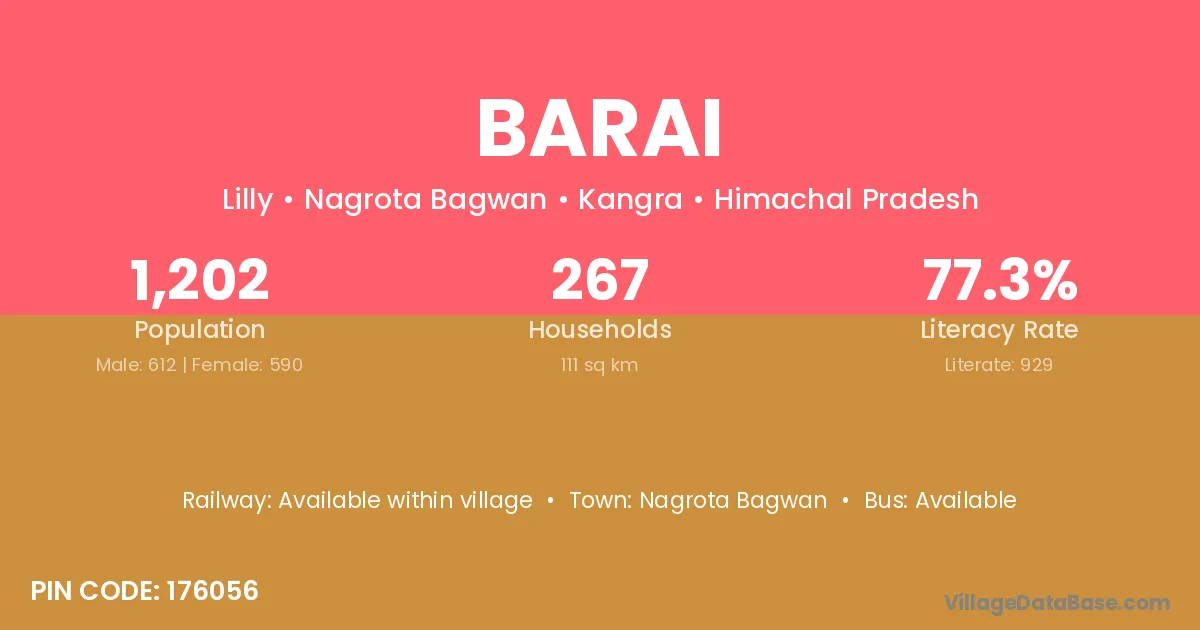 The literacy rate of Barai village is 82.79%. Male literacy stands at 87.04% and female literacy at 79.41%.