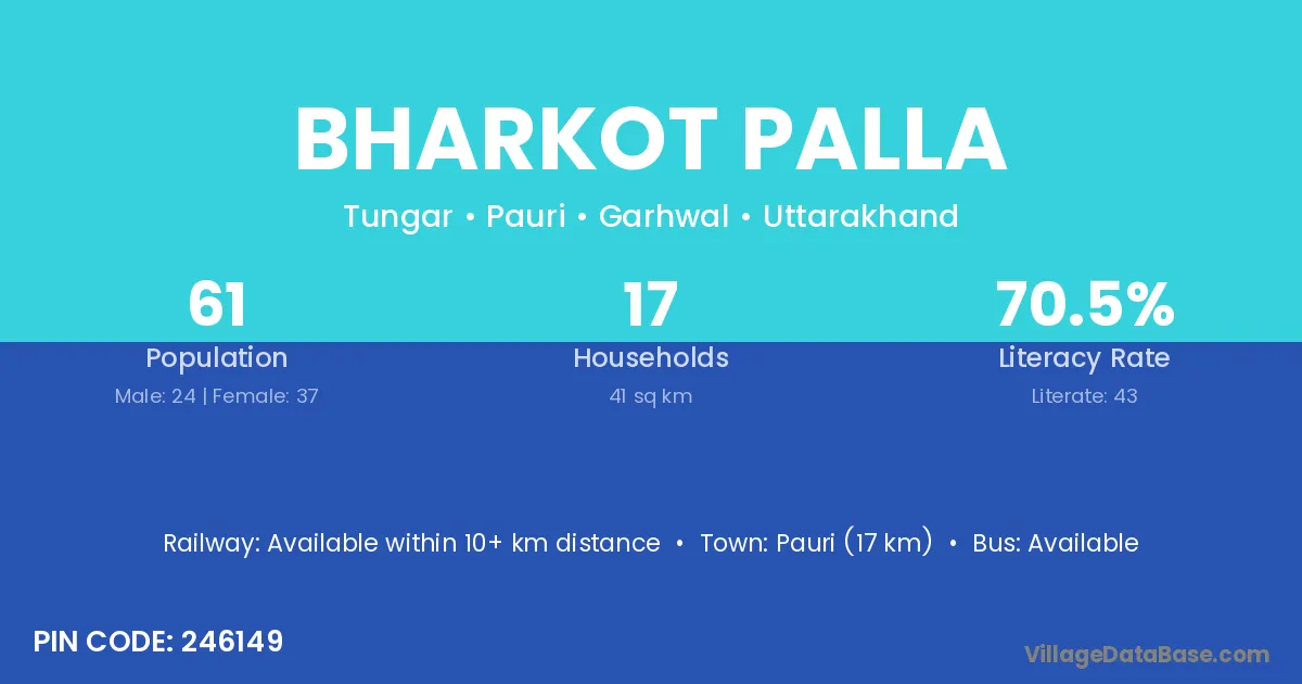 Pauri (17 km) is the nearest town to Bharkot Palla village for major economic activities and is located approximately 17 km away.
